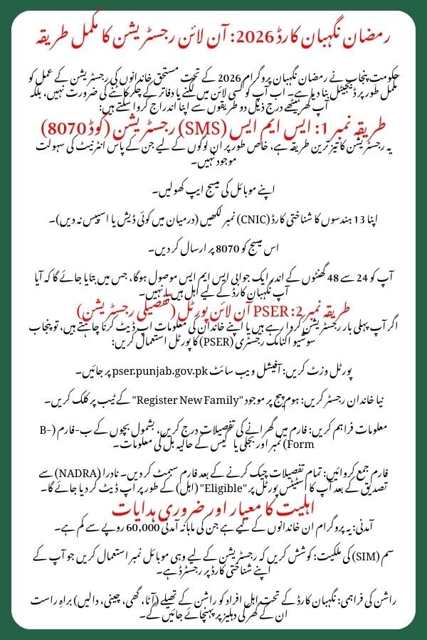 The Ramzan Nigehban Card 2026 is a landmark initiative that blends financial aid with food security. By registering through the 8070 code or the PSER portal today, you can secure essential support for your family during the blessed month.
